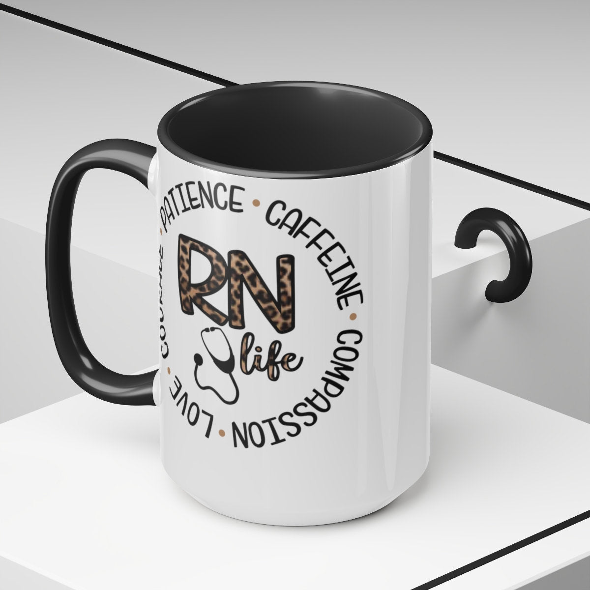 Here to bring big gulps of coffee and style, these two-tone Animal Print RN, Nurses coffee mugs help people around the world start the day just right. Choose between 5 different color options to best complement your designs. Each mug comes with a colored handle, a colored interior, and a classy, glossy finish so that your mugs become an instant favorite. \n.: Material: 100% ceramic\n.: One size: 15oz (0.44 l)\n.: Glossy finish\n.: Interior and handle available in 5 colors\n.: Easy-grip C-shaped handle