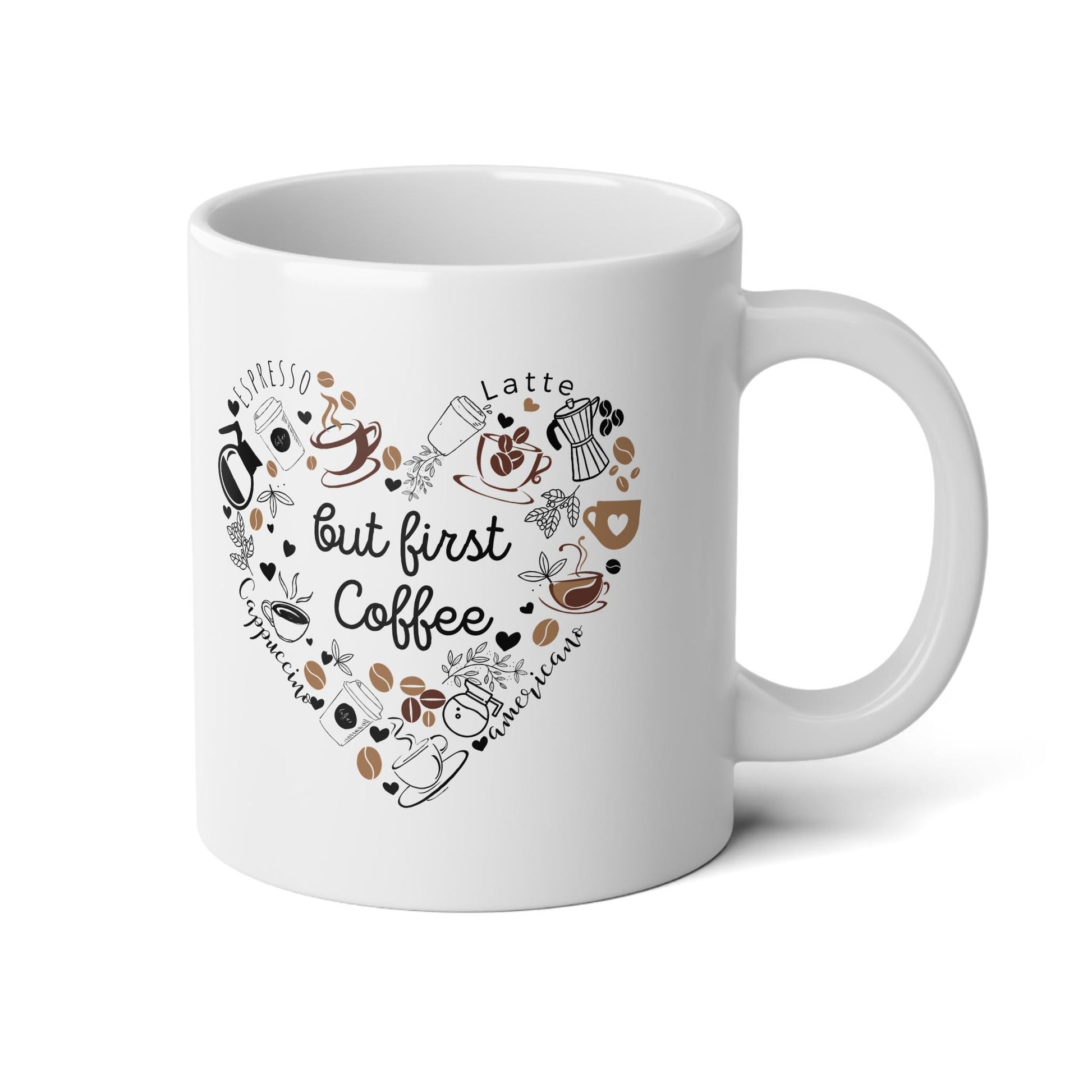 But first coffee, coffee mug, coffee cup, houmous saying, Jumbo Mug, 20oz. Perfect for that extra boost of coffee or large amounts of hot cocoa on a rainy day, this ceramic mug comes in the perfect size: 20oz (0.6l). Thanks to the ORCA coating, your original designs will be printed in picture-perfect quality on the white ceramic base with a glossy finish. The mug features a C-shaped, easy-grip handle.
