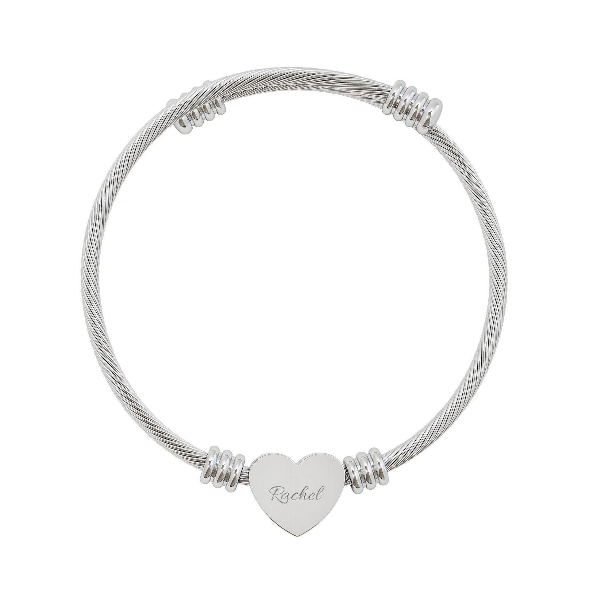 A delicate, heart-adorned cuff that feels like a quiet promise on the wrist. This slim cable bracelet is finished in surgical-grade stainless steel with a subtle PVD sheen, and the little heart charm (13.5 x 11 mm) can be engraved with initials or a tiny date for a personal touch. It arrives in a white gloss jewelry box lined with non-tarnish cotton fiber, ready to be given or kept. Lightweight, sturdy, and kind to sensitive skin, this cuff slips on easily and holds its shape — an everyday piece that ages with memories rather than dulling with wear.