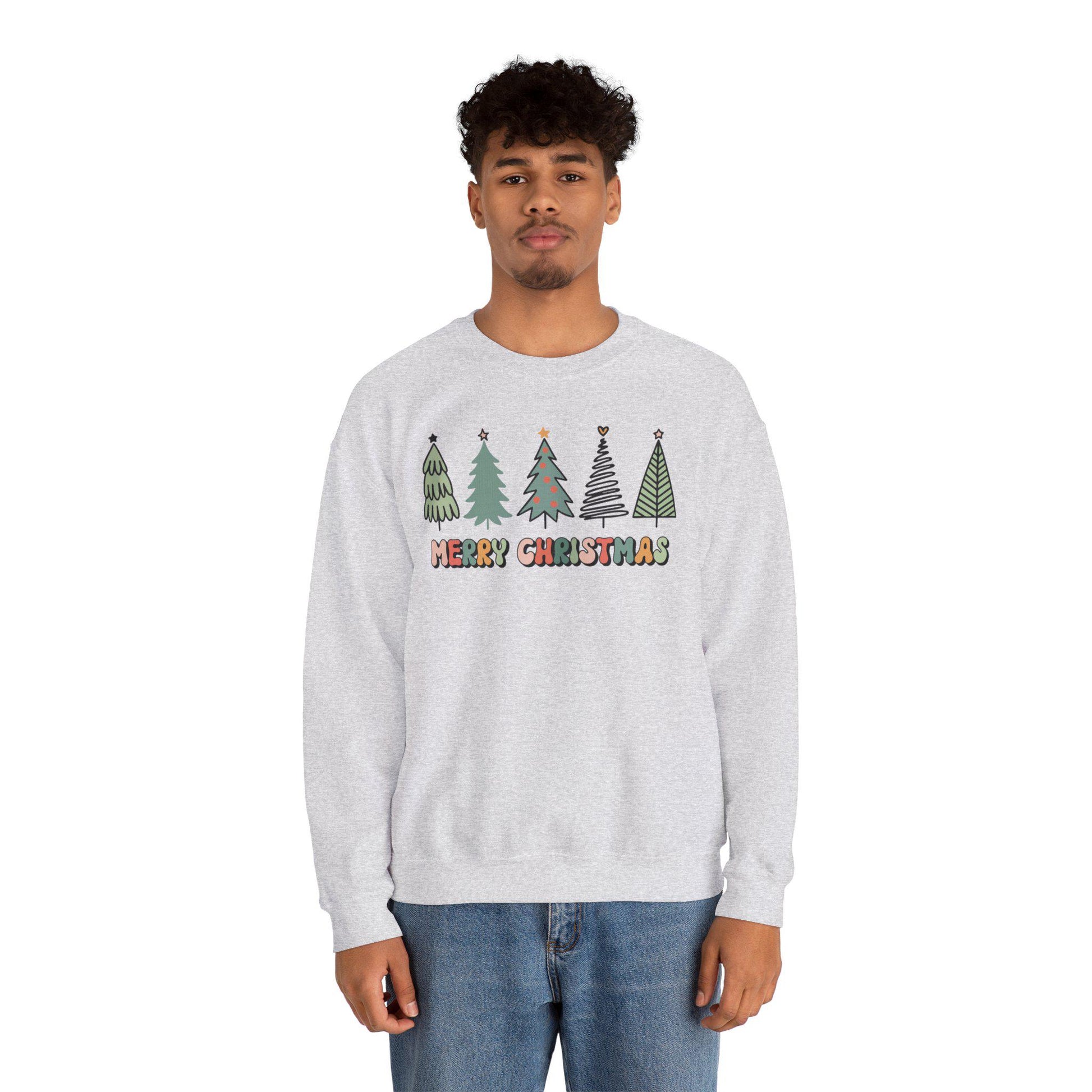 Womens retro Christmas Sweatshirt, Christmas Tree Shirt, Farmhouse Christmas Sweater, Minimalist Holiday Shirt, Winter Crewneck Sweatshirt. Ideal for any situation, a unisex heavy blend crewneck sweatshirt is pure comfort. These garments are made from polyester and cotton. This combination helps designs come out looking fresh and beautiful. The collar is ribbed knit, so it retains its shape even after washing. There are no itchy side seams on these sweaters.