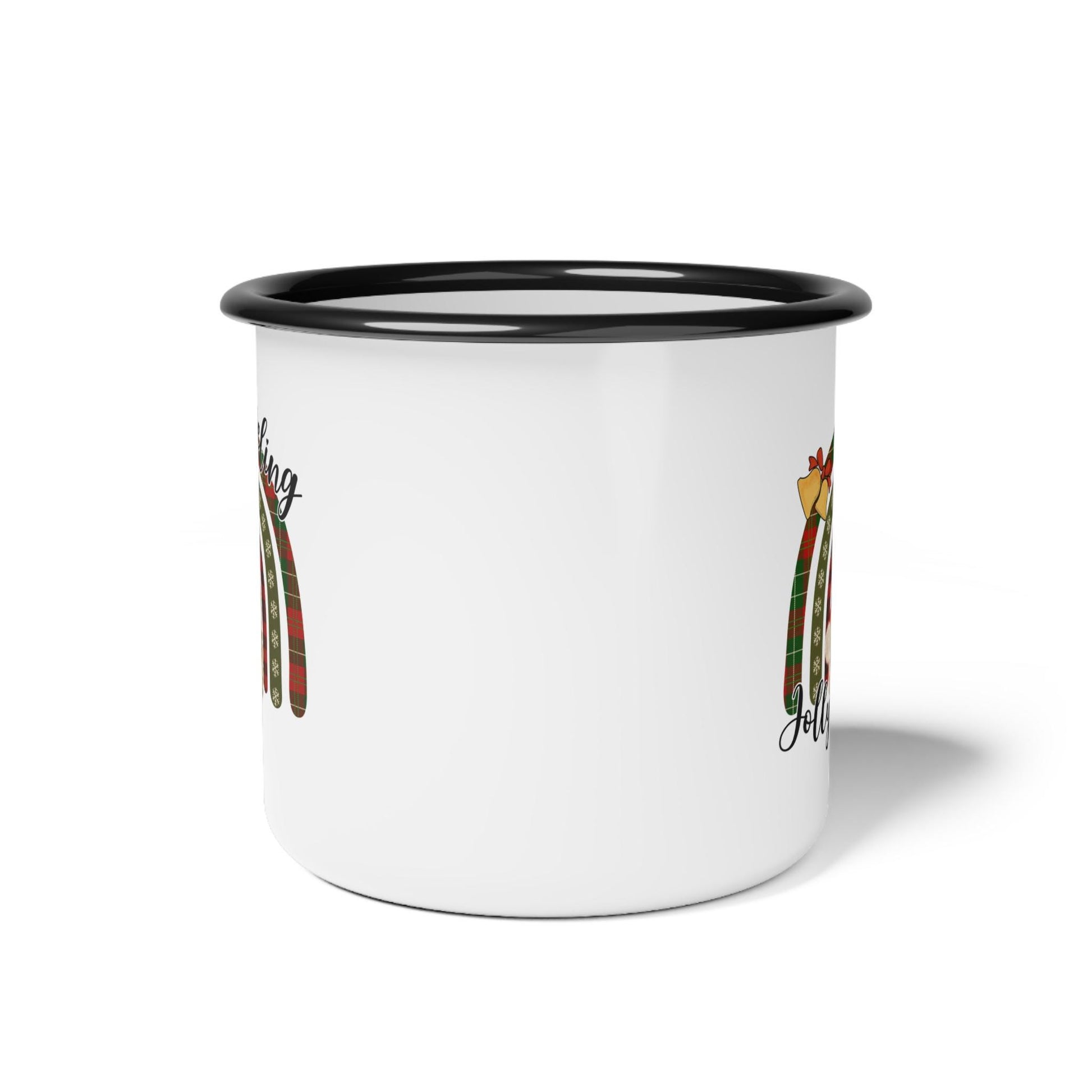 Retro, Santa, Feeling Jolly, Festive Enamel Camp Cup. Born to be in the Great Outdoors, this custom enamel mug is a camper's best sidekick. With 12oz. for your favorite beverage, these camping mugs are anti-alkali and acid-proof, making them a hard-wearing choice for any adventure. Plus, when at home, they can be tossed in the dishwasher for hassle-free cleaning. Add your unique designs and create an instant favorite.