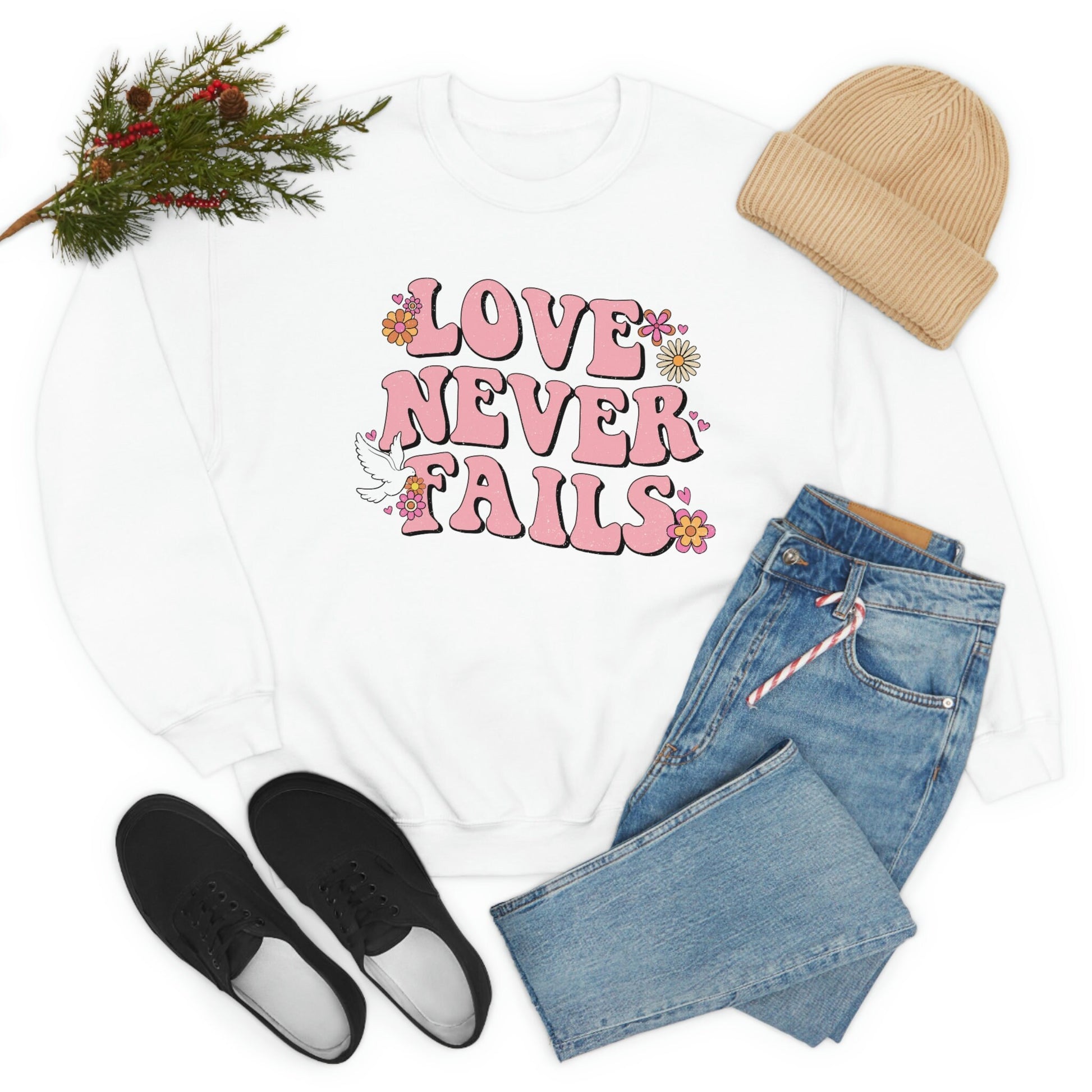 Valentines, Love, Love Never Fails, Unisex Heavy Blend Crewneck Sweatshirt. Ideal for any situation, a unisex heavy blend crewneck sweatshirt is pure comfort. These garments are made from polyester and cotton. This combination helps designs come out looking fresh and beautiful. The collar is ribbed knit, so it retains its shape even after washing. There are no itchy side seams on these sweaters.