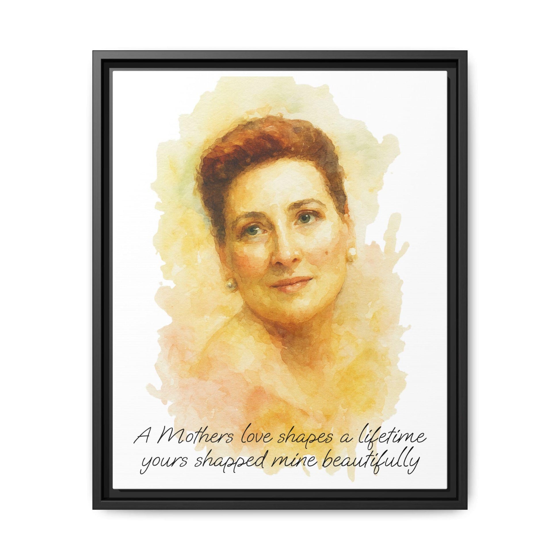 A framed matte canvas print that feels like a quiet conversation with a memory. The soft watercolor portrait floats on a clean white field, surrounded by a slim pine frame finished in your choice of color. The coated cotton-poly canvas keeps colors luminous and skin tones warm, while the solid radial pine stretcher gives the piece a subtle depth on the wall. It hangs easily with sawtooth hardware and arrives ready to display — a gentle focal point for a hallway, reading nook, or living room that favors restrained, personal artwork.