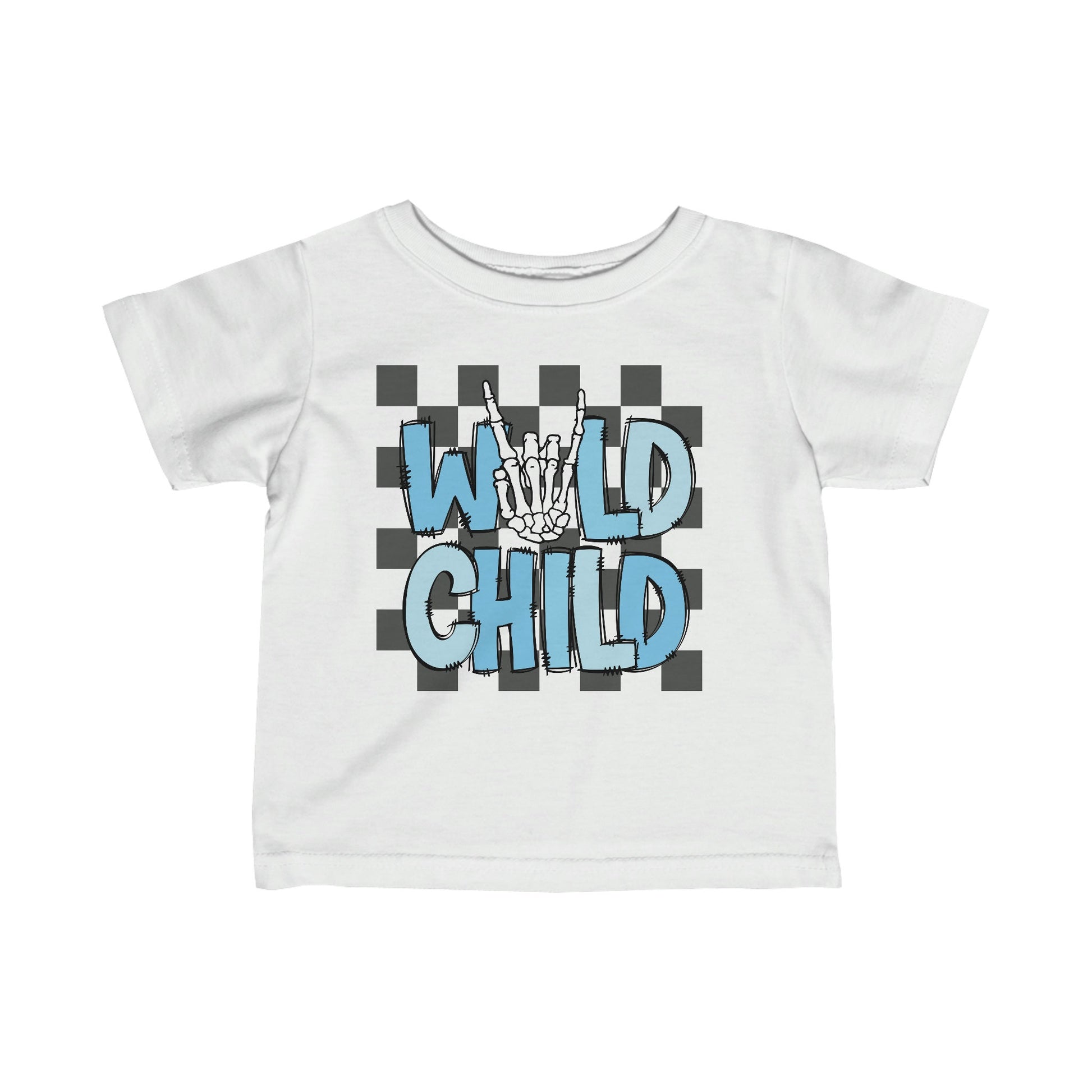 wild child, skeleton, Infant Fine Jersey Tee. Striking the perfect balance between comfort for younglings and toddler-specific durability, this infant fine jersey tee delivers on all fronts. Featuring side seams to better support the garment’s shape, these tees also come with ribbed knitting for improved durability and taped shoulders for a breezy fit. Solid colors are 100% soft ring-spun cotton, but heather colors include polyester.